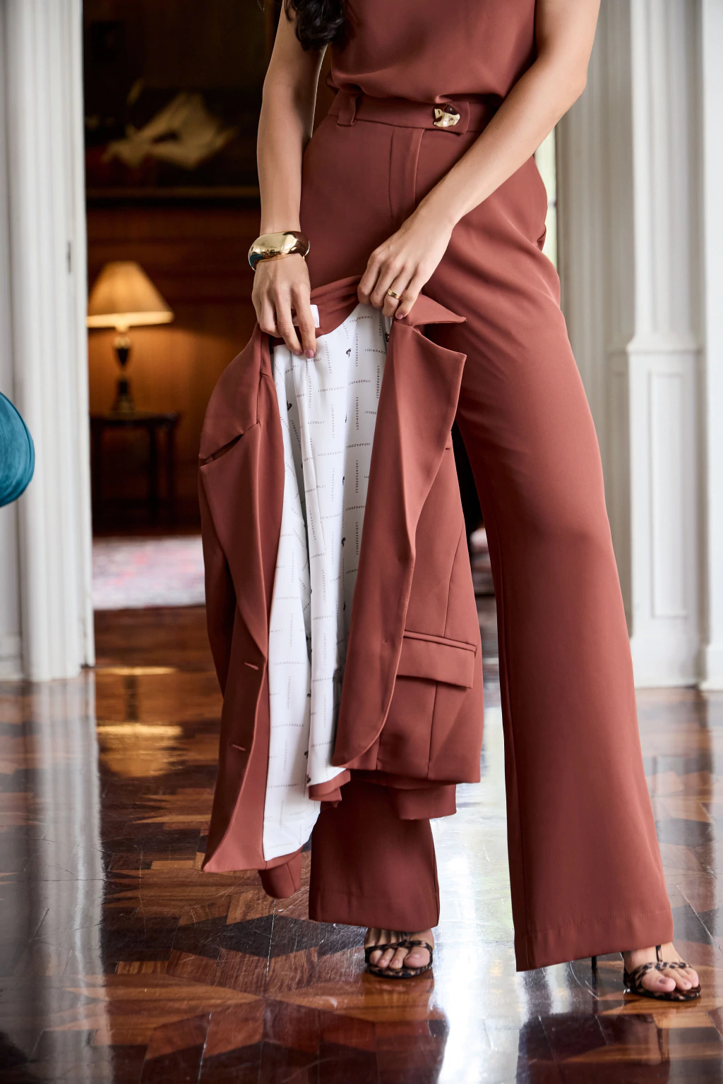 O blazer apresenta gola V com lapela, ombreiras estruturadas e manga longa, garantindo um visual clássico. Os bolsos frontais com lapela e os recortes laterais valorizam o design moderno, enquanto o fechamento frontal com botões de metais orgânicos agrega um toque sustentável.